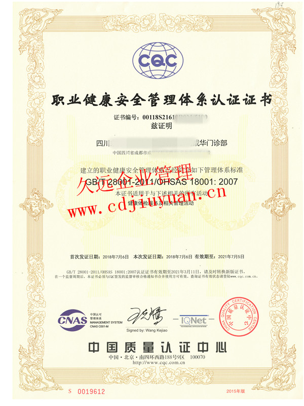 職業(yè)健康安全管理體系認(rèn)證證書