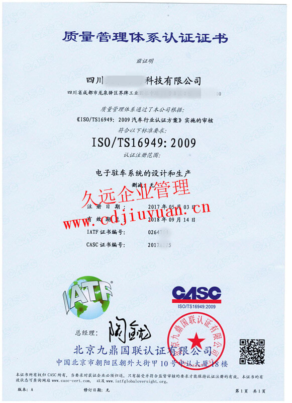 IATF16949汽車質(zhì)量管理體系認(rèn)證證書
